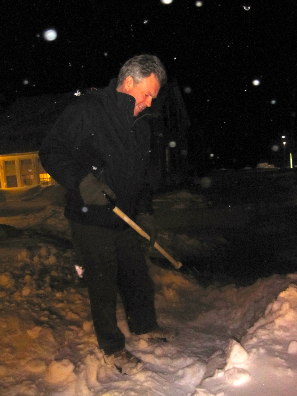 Chas Eller, after a snow storm, clearing the path from the rehearsal studio to the cars
